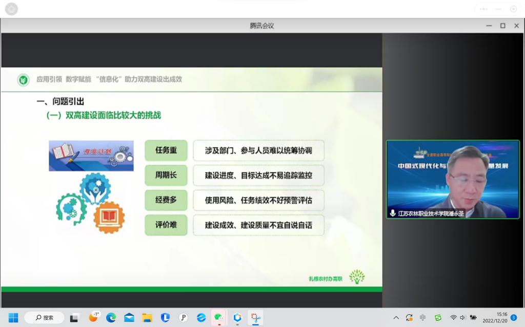 12月20日,全国职业高等院校校长联席会议在线上召开2022年年会。学院院长潘永圣应邀作“应用引领数字赋能信息化助力双高建设出成效”交流发言。
