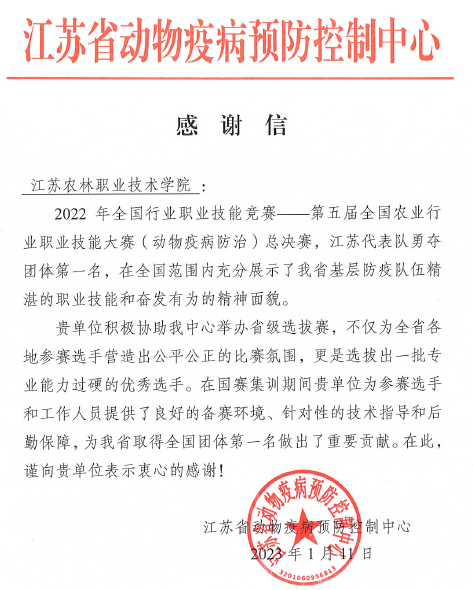 近日,江苏省动物疫病预防控制中心向必赢官网发来感谢信,对必赢官网畜牧兽医学院在2022年8-9月承办全国行业职业技能竞赛—第五届全国农业行业职业技能大赛江苏省选拔赛中做出的贡献表示感谢。