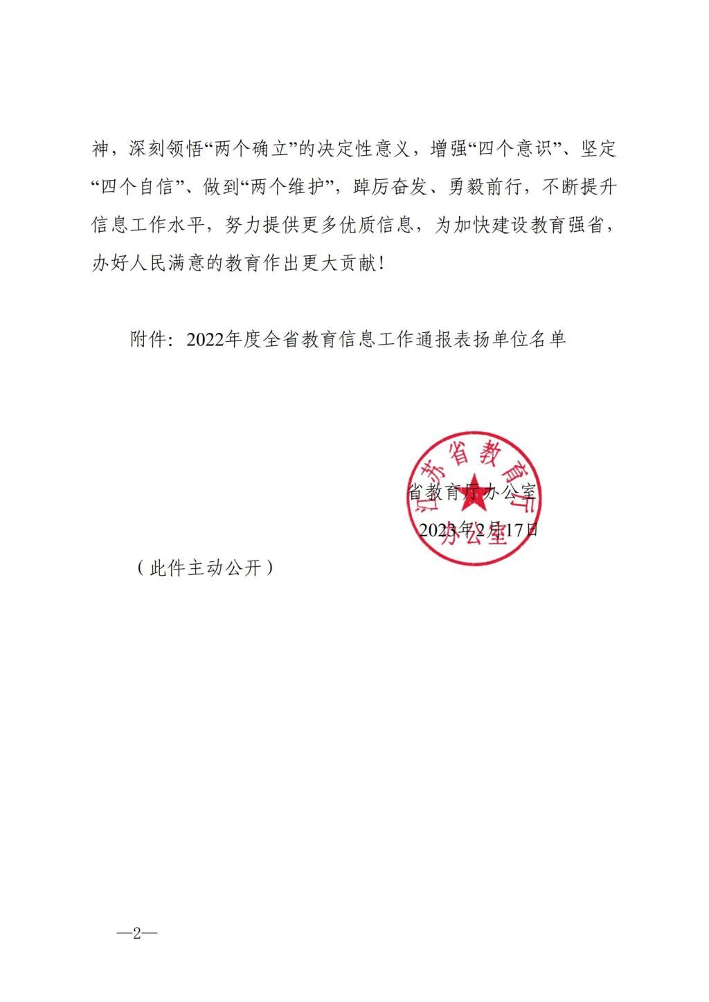 近日,《省教育厅办公室关于对2022年度全省教育信息工作相关单位予以通报表扬的通知》(苏教厅办函〔2023〕3号)发布,必赢官网获评“全省教育信息工作表扬单位”。