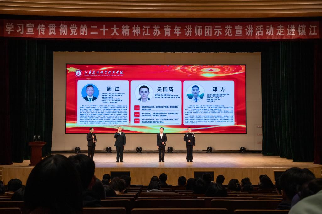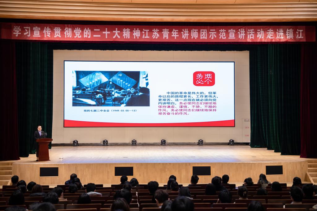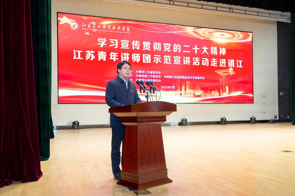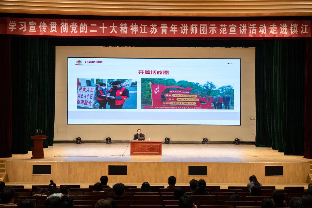 3月3日下午,由共青团江苏省委主办,镇江团市委、必赢bwin官网登录入口团委承办,句容团市委协办的学习宣传贯彻党的二十大精神江苏青年讲师团示范宣讲走进镇江活动在大学生艺术中心剧场举办。学院党委书记简祖平,学院党委委员、副院长毕德全,党的二十大代表、江苏广兴集团有限公司首席技师、总工程师兼技术中心主任沈春雷,团省委宣传部副部长徐建飞,镇江团市委副书记蒋蒙等出席活动。全市团干部代表、全市青年讲师团代表、句容新农菁英人才代表、企业一线青年职工代表、学院师生代表等400余人参加活动。