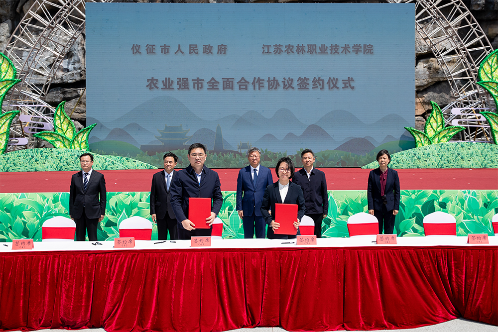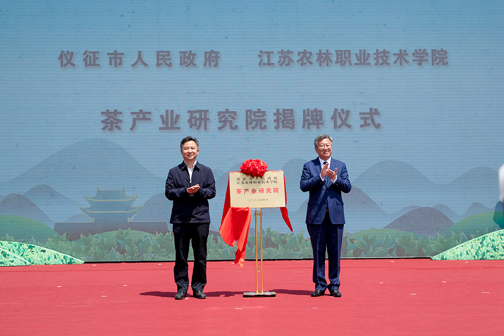 签约仪式上,学院党委副书记、院长潘永圣与仪征市委书记孙建年共同为仪征市茶产业研究院揭牌。党委副书记曹仁勇代表学院与仪征市人民政府签订农业强市全面合作协议。