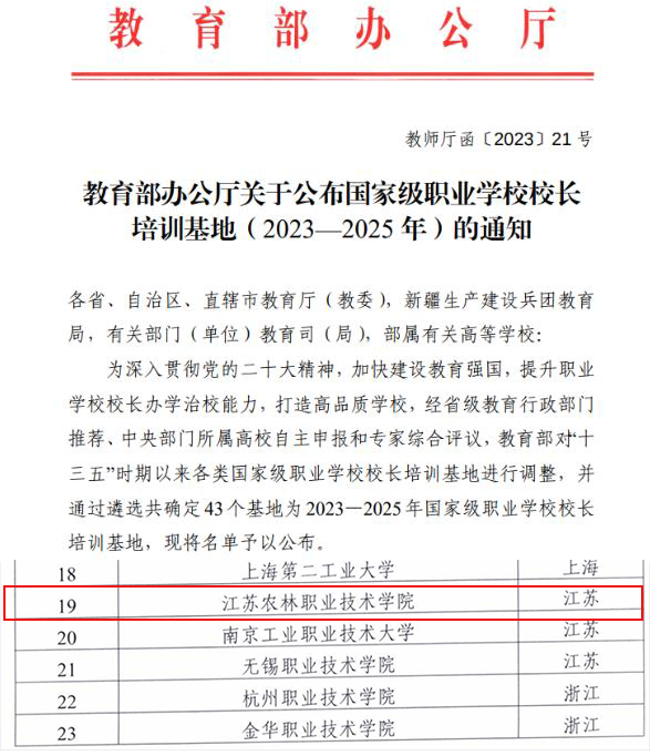 近日,教育部办公厅印发了《关于公布国家级职业学校校长培训基地(2023-2025年)的通知》(教师厅函〔2023〕21号),通过遴选共确定43个国家级职业学校校长培训基地,必赢官网成功入选。