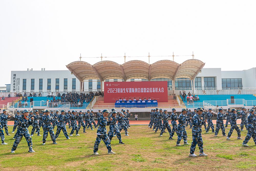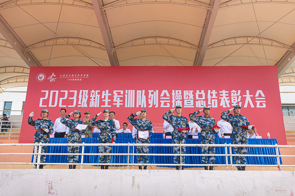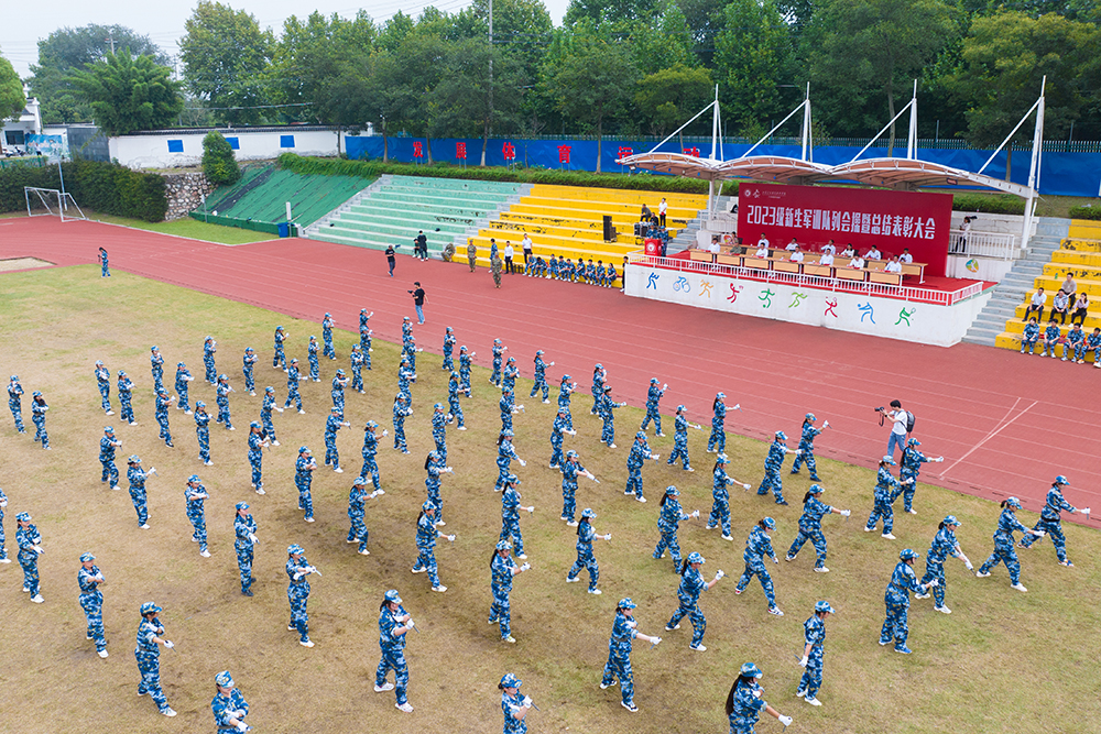 9月27日上午,必赢官网2023级新生军训队列会操暨总结表彰大会分别在本部和茅山校区举行。学院党委副书记、院长潘永圣,党委副书记曹仁勇,党委委员、副院长毕德全,党委委员、纪委书记孙俭,句容市人武部副部长马明,学院相关部门、各二级学院和茅山校区主要负责人参加了大会。大会由毕德全主持。