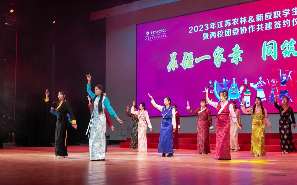 10月16日晚,“苏疆一家亲 共筑职教梦”江苏农林&新应职学生联欢会暨两校团委协作共建签约仪式在大学生艺术中心剧场举办。学院党委副书记、院长潘永圣和新疆应用职业技术学院党委副书记、院长叶列吾别克·那克斯别克出席活动并致辞。两校团委负责人共同签订了协作共建协议,美育教育中心聘任新疆应用职业技术学院艺术学院2位专业老师为大学生艺术团校外指导教师。