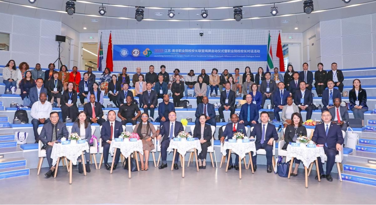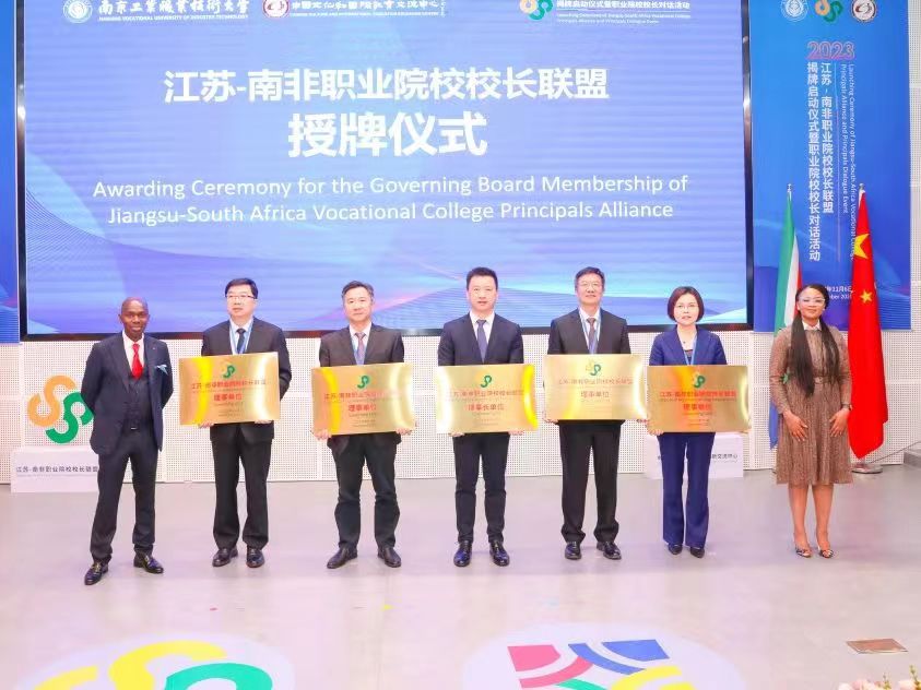 11月6日,“江苏-南非职业院校校长联盟”揭牌启动仪式暨职教院校校长对话活动在南京工业职业技术大学仙林校区举办。南非高等教育和培训部培训署署长穆卡佩勒·莫胡·基夫特、南非公立学校校长组织副主席库拉·唐吉斯尼·朱丽叶、南非公立学校校长组织副秘书长恩科博·杰弗里·泰姆巴、江苏省教育厅副厅长杨树兵、江苏省人民政府外事办公室副主任杨菁,以及来自南非的8家职业院校和江苏省内11家职业院校的首届江苏—南非职业院校校长联盟理事成员学校80余人参会。