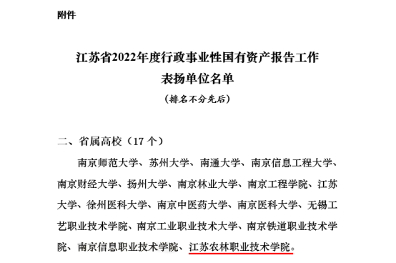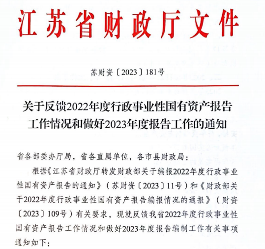 近日,根据《江苏省财政厅关于反馈2022年度行政事业性国有资产报告工作情况和做好2023年度报告工作的通知》(苏财资〔2023〕181号),学院高质量完成了学院2022年度行政事业性国有资产报告工作,在省财政厅对该项工作的考评中获得表扬。