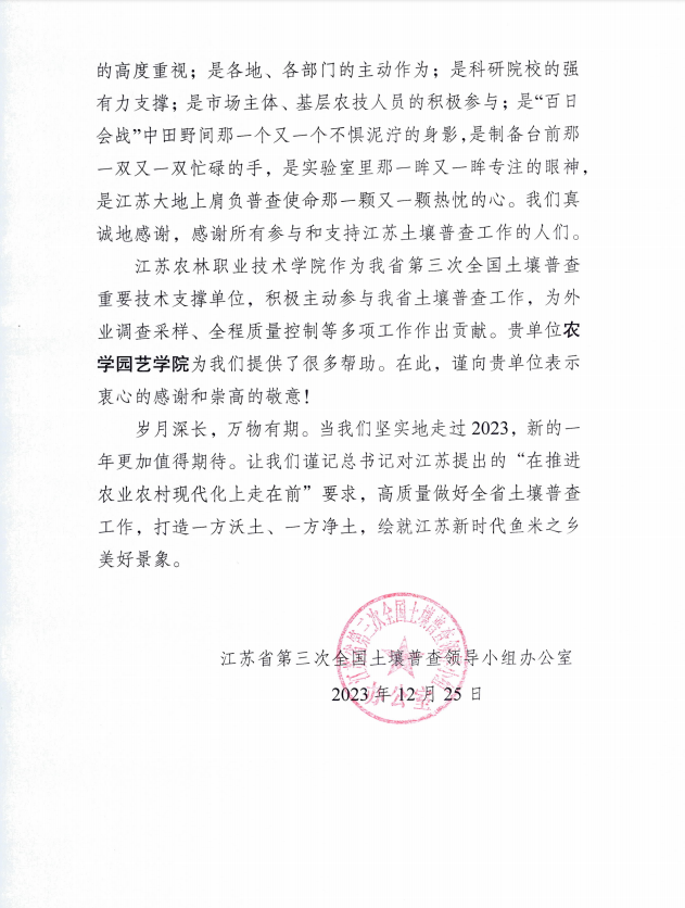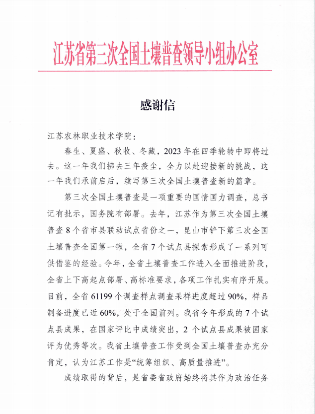 近日,江苏省第三次全国土壤普查领导小组办公室为必赢官网发来感谢信,对必赢官网农学园艺学院在2023年江苏省第三次全国土壤普查中做出的贡献给予高度肯定。