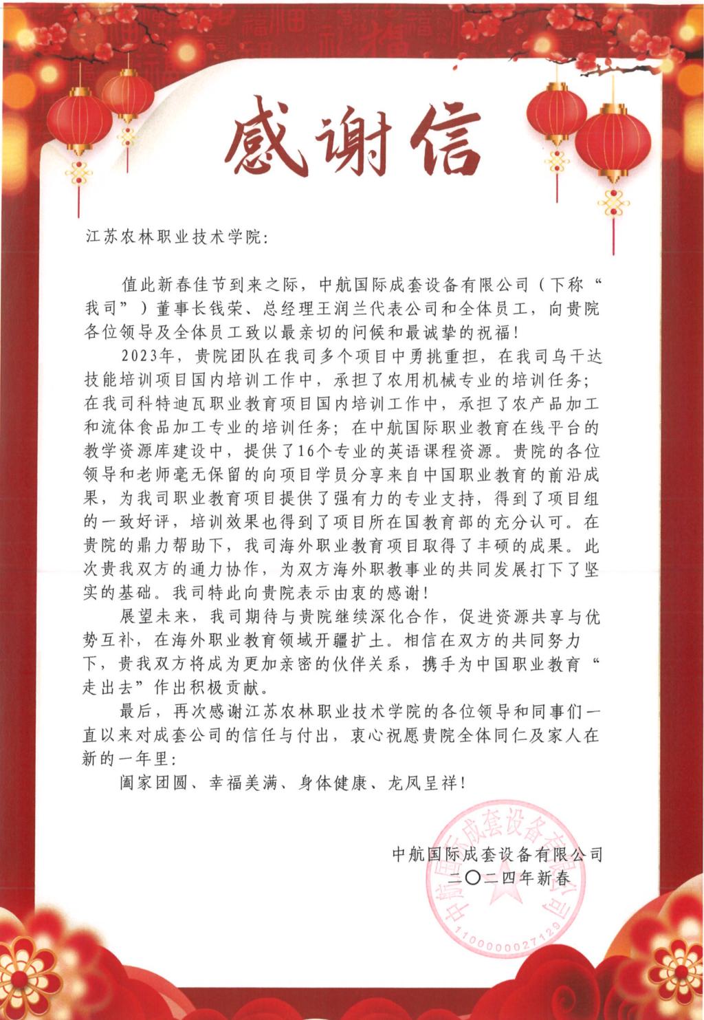 近日,中航国际成套设备有限公司给必赢官网发来感谢信,对必赢官网2023年度开展的乌干达、科特迪瓦等来华师资培训以及在中航国际职业教育在线平台的教学资源库建设中所做的工作表示肯定和感谢。