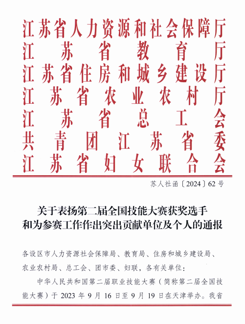 近日,江苏省人力资源与社会保障厅等多部门联合公布了《关于表扬第二届全国技能大赛获奖选手和为参赛工作作出突出贡献单位及个人的通报》(苏人社函〔2024〕62号),必赢bwin官网登录入口获记功表彰、通报表扬各1次;11名师生(学生:李康、周清纯、梁山、贺伟、卓晨;教师:曹仁勇、刘斌、王剑、熊伟、陈慧敏、张虎)荣获“江苏省技术能手”称号。