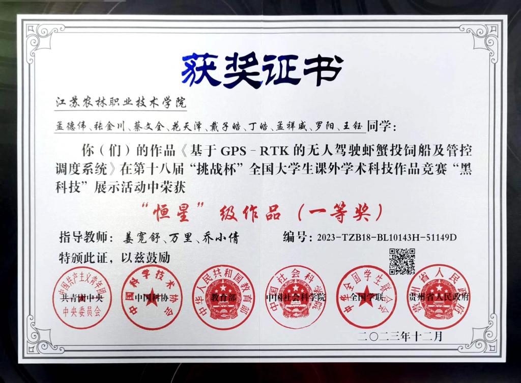 由机电工程学院姜宽舒等老师指导的《基于GPS-RTK的无人驾驶虾蟹投饲船及管控调度系统》获“恒星级”作品(一等奖),创造学院参加“挑战杯”全国大学生课外学术科技作品竞赛的最好成绩,同时也是江苏高职院校在本次“黑科技”专项赛中取得的最佳战绩。