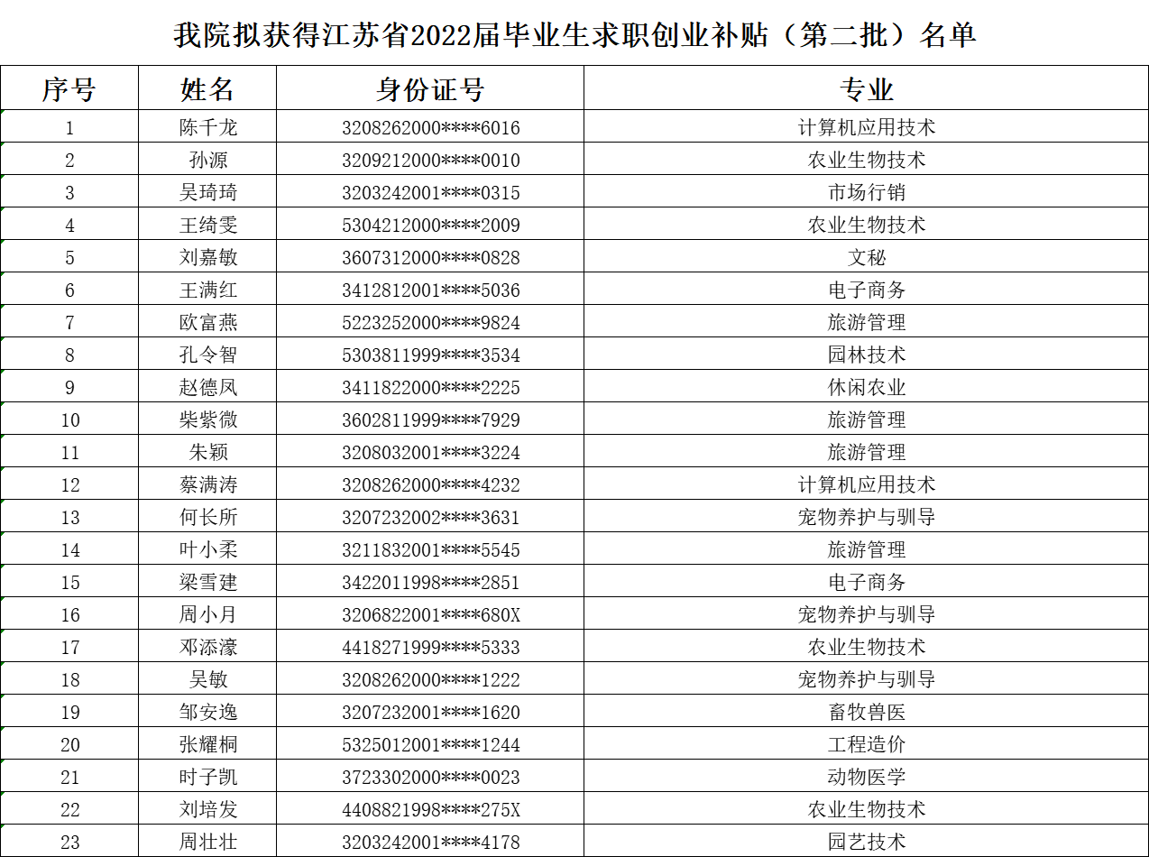 根据《省人力资源和社会保障厅、省教育厅、省财政厅关于做好求职创业补贴发放工作通知》(苏人社发〔2019〕198号)、《省人力资源和社会保障厅、省教育厅、省财政厅关于进一步明确求职创业补贴申领发放有关问题的通知》(苏人社函〔2021〕154号)的文件要求,经本人申请,学院学生工作处初审,句容人社复审。现拟定以下同学享有江苏省2022届毕业生求职创业补贴(第二批)发放资格,现予以公示。对以下获得补贴发放资格的同学如有异议,请于2022年5月25日前到学工处董燕红老师处反映,地点:综合楼二楼东205,联系电话:0511-87290222。
