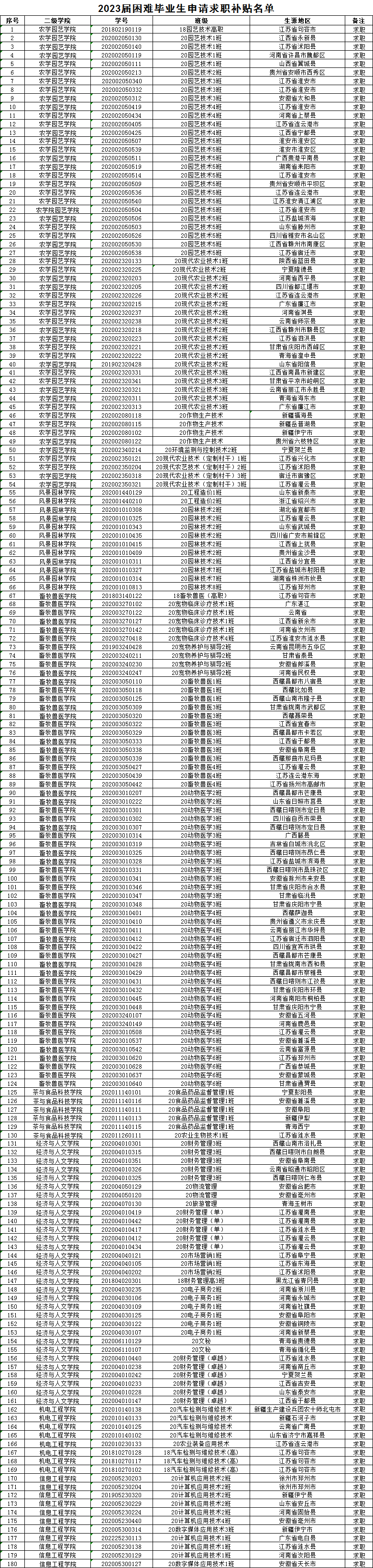 根据《必赢bwin官网登录入口困难毕业生就业帮扶工作实施方案》的要求,经本人申请,班级推荐、二级学院初审,学院学生工作处就业指导中心和学生资助中心最终审核,推荐以下同学拟获得2023届困难毕业生求职补贴,现予以公示。