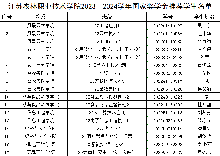 根据教育部《关于做好2024年普通高校本专科生国家奖学金评审工作的通知》(教助中心〔2024〕27号)、《省教育厅省教育厅关于做好2024年普通高校国家奖学金国家励志奖学金有关工作的通知》及《必赢bwin官网登录入口国家奖学金管理实施办法》精神,经本人申请、班级推荐、二级学院初审,学院最终审核,拟推荐以下17位同学申报国家奖学金,现予以公示。
